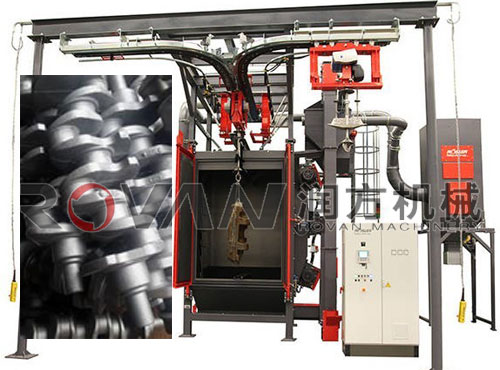 至于小一些的曲軸如φ152~203mm長914mm通常是利用吊鉤式拋丸機拋丸清理曲軸懸掛在吊鉤上然后經懸鏈的轉動送入安裝有多個拋頭的拋丸室體內進行拋丸清理吊鉤在拋丸室里360°旋轉曲軸表面在高速丸流下被清理其清理速度能夠到達250件/h,且清理效果非常好