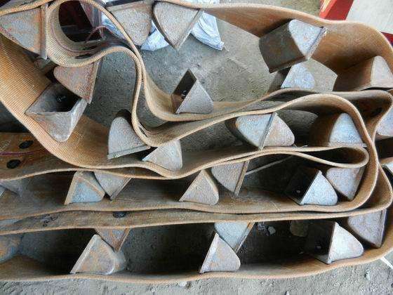 根據(jù)實(shí)際輸送量和需要提升的高度,確定拋丸機(jī)提升帶的使用拉伸強(qiáng)度。一般情況下,經(jīng)向拉伸強(qiáng)度主要起牽引和傳動(dòng)作用,而緯向拉伸強(qiáng)度對備斗的安裝、物料容重影響較大。具體計(jì)算方法和參數(shù)確定時(shí)還要結(jié)合備斗的選用情況、頭輪直徑、頭輪覆膠、螺釘?shù)倪x用情況。一般在同樣拉伸強(qiáng)度下,選用鋼備斗時(shí),宜采用PvC整芯提升帶或?qū)訑?shù)較多的橡膠提升帶,增加緯向拉伸強(qiáng)度;頭輪直徑偏小,宜采用PVC整芯提升帶或?qū)訑?shù)較少的橡膠提升帶,增加屈撓性,減少彎曲疲勞和分層變形。頭輪覆膠將增加傳動(dòng)效率,延長提升帶的使用壽命。