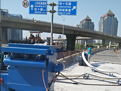 2、基層處理設備采用具備同步清除浮漿及吸塵功能的設備、帶有驅動行走系統的自循環回收的拋丸設備來進行橋面混凝土基層處理。