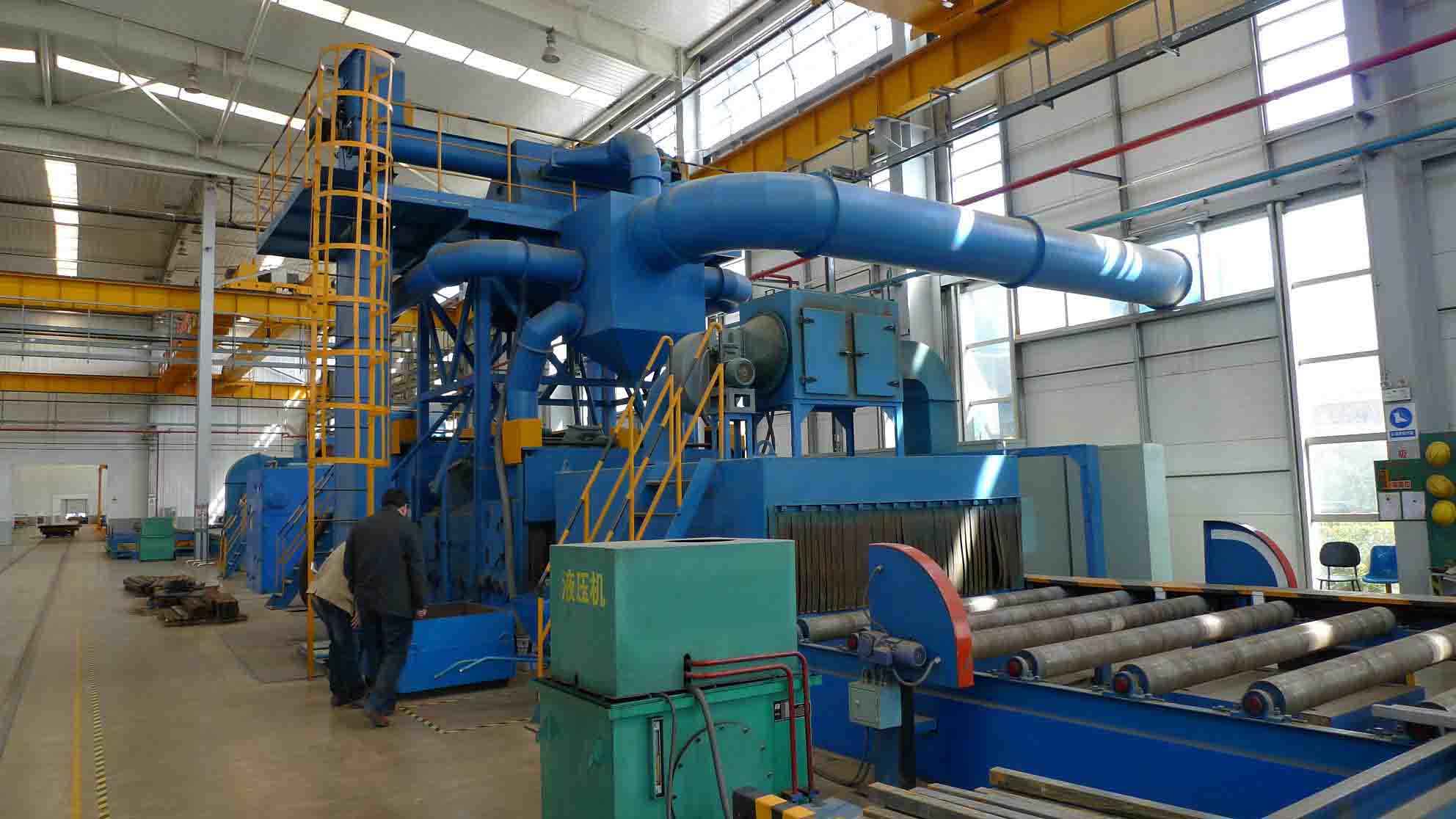 通過式拋丸機,清理過程中由電氣控制的可調速輸送輥道將鋼結構件或鋼材送進清理機室體內拋射 通過式拋丸機區,其周身各面受到來自不同坐標方位的強力密集彈丸打擊與磨擦,使之其上的氧化皮、銹層及其污物迅速脫落,鋼材表面就獲得一定粗糙度的光潔表面,在清理室外兩邊進出口輥道裝卸工件。