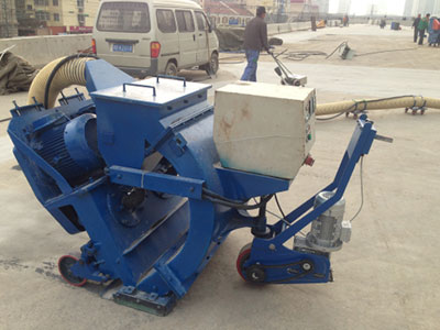 路面拋丸機是利用電機驅動的拋丸輪在高速旋轉過程中產生離心力和風力,一定顆粒度的彈丸流入進丸管時(可以控制彈丸的流量)便被加速帶入高速回轉的分丸輪中,在離心力的作下,沖擊工作平面起著清理強化的作用。然后彈丸和灰塵、雜質一起經過反彈室來到儲料斗的上方。路面拋丸機配有除塵器,可做到無塵無污染施工,既提高了效率,又保護環境。