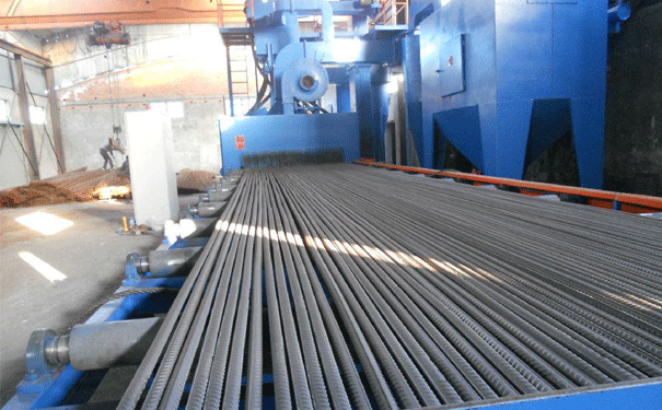 鋼筋線材鋼管拋丸機的型式分為單線縱向噴吹、多線橫向噴吹、整盤線材散圈拋丸、整捆式大盤重拋丸4種型式。連續式直通鋼筋拋丸機常見的有1根、5根、15根、18根,最多40根。為了保證清除鐵皮的效果,一般配置3~6個拋射裝置,這些拋丸輪配置在線材的上部或下部,可縱向拋射,也可橫向噴射,拋出的丸粒扇面要覆蓋線材通過的整個寬度。這種拋丸機大多數與其他設備組成聯合生線,如單根拋丸與聯合拉拔機組成拋丸聯合拉拔作業線。