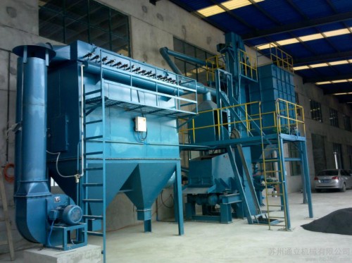 樹脂砂生產線是由磁選皮帶輸送機、震動破碎再生機、離心轉子二次二級再生機、砂庫、斗式提升機(3套)、移動雙臂連續式樹脂砂混砂機、脈沖反吹式除塵器等設備組成的。樹脂砂生產線工藝流程:澆注后的砂箱及鑄件由行車吊至慣性振動落砂機上,經落砂處理后,鑄件運到清鏟車間,砂箱運至砂箱庫備用。大塊夾皮,冒口由人工分揀,通過落砂柵格的砂子、砂團以及小塊冷鐵落至磁選皮帶機,經磁選后輸送至多功能振動破碎再生機進行破碎、脫膜、篩分,經過篩分后的砂子進1#斗式提升機,由提升機提升至離心轉子二級再生機進行強力再生,充分脫膜。混合著微粉、灰塵、樹脂膜的再生砂經流砂槽流入流幕式風選機,風選機連接著旋風除塵器及脈沖式反吹除塵器,將微粉、灰塵去除。再生砂再經2#斗式提升機提升至砂庫備用。移動雙臂式連續樹脂砂混砂機上方進料口由氣動閘板與砂庫下方出砂口相連,按下混砂機電控箱混砂按扭后,氣動閘板自動打開,定好量的砂子由砂庫流入混砂機。在混砂機中砂子經螺旋片向前輸送至混砂開始端,自近端控制閥加入固化劑,經小葉片攪攏預混至后面的近端閥加入樹脂,進入混砂端。固化劑、樹脂、再生砂充分混勻后送至前端出料口自動流入準備好的砂箱內用于造型、制芯。此設備由進口PLC(編程可控)控制自動化性能卓越,適用于樹脂砂工藝的中小鑄造企業。
