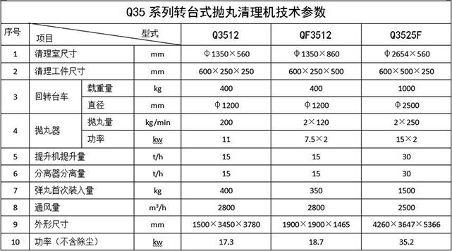 Q35系列轉臺式拋丸清理機主要適合中小型工件的表面清理的生產,設備適合于清理發動機連桿,齒輪,膜片彈簧等,廣泛應用于鑄造和汽車制造業,并且具有生產效率高,密封效果好,結構緊湊,裝卸件方便技術含量高等特點。為保證清理效果、提高生產率,在本機的設計中,采用直聯曲線葉片拋頭,而且在原有設計的基礎上重新調整了拋頭位置,首先拋頭與水平垂直有一定夾角,以利于工件內腔的清理;其次轉臺支承完全改觀,便于維修、裝卸。
